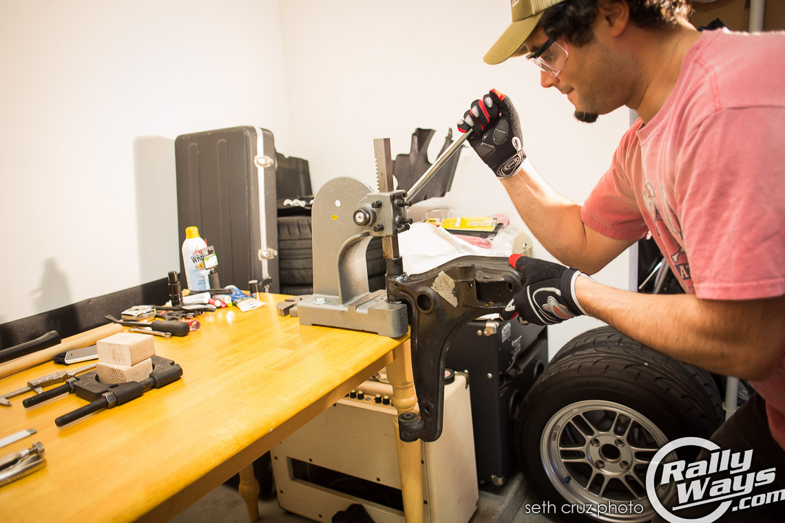 There are many ways to remove the stock bushings. I like the environment. But Priuses suck. Regardless, I don’t believe in torching the old units out. Actual burning rubber is not good for anyone. I had heard of people successfully pushing out old bushes using a big c-clamp and a socket. However, I decided to run by Harbor Freight and and use one of their 25% off coupons instead. The trip to HB had me coming back home with a $30 (after discount) 1-ton arbor press which I then bolted to my workbench. The press is the number #3552 1 ton arbor press at Harbor Freight.