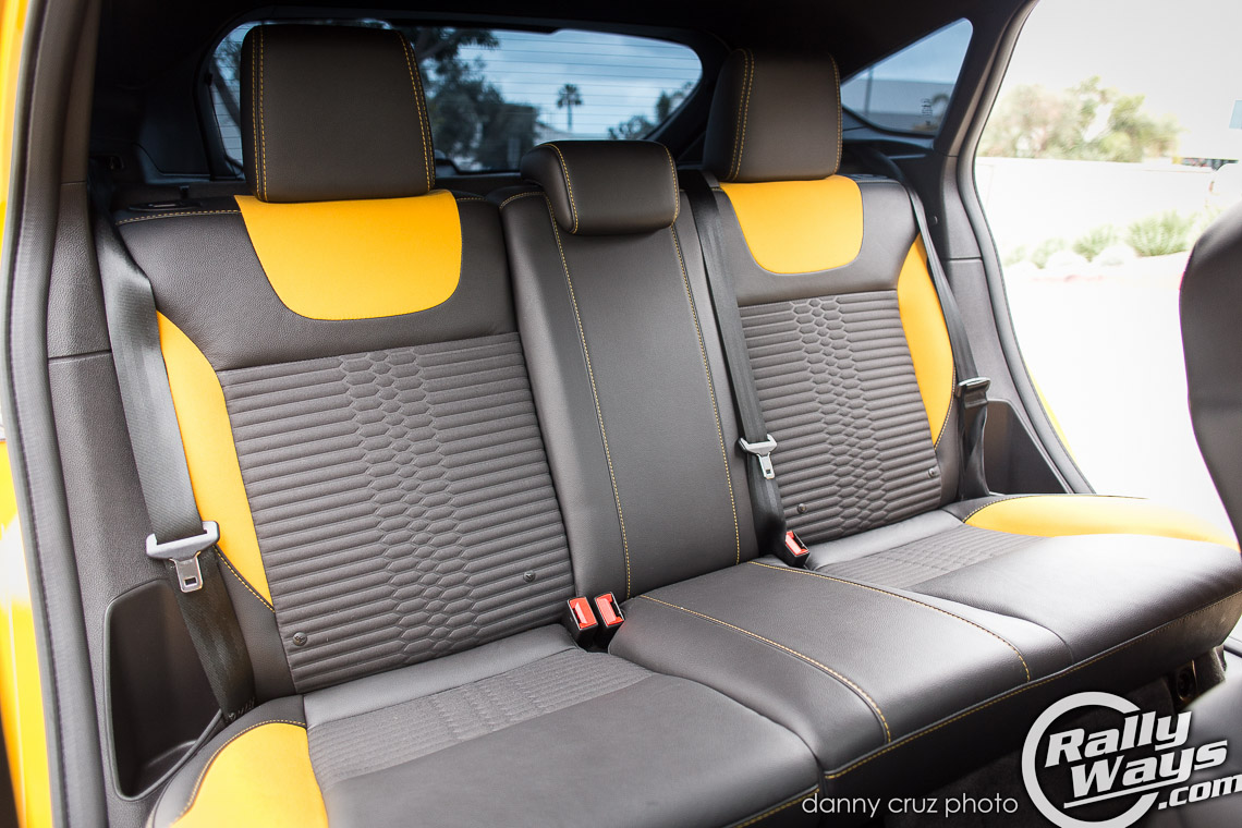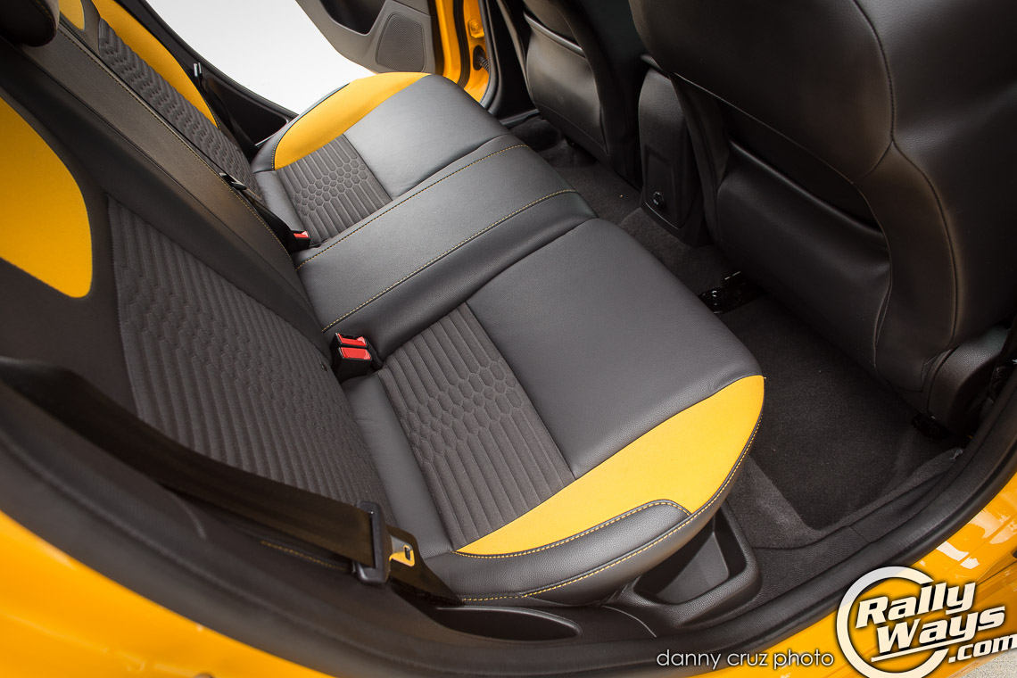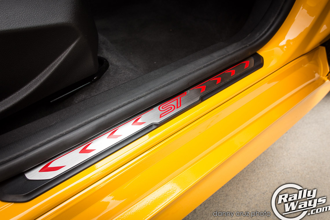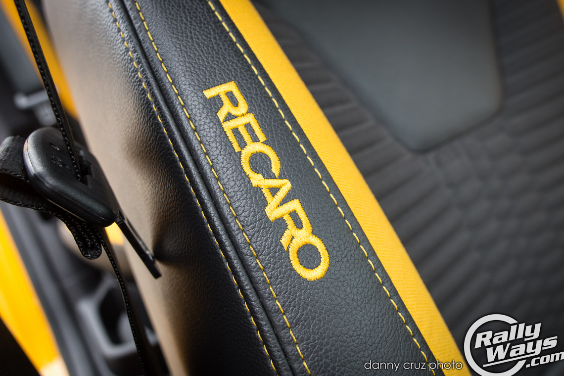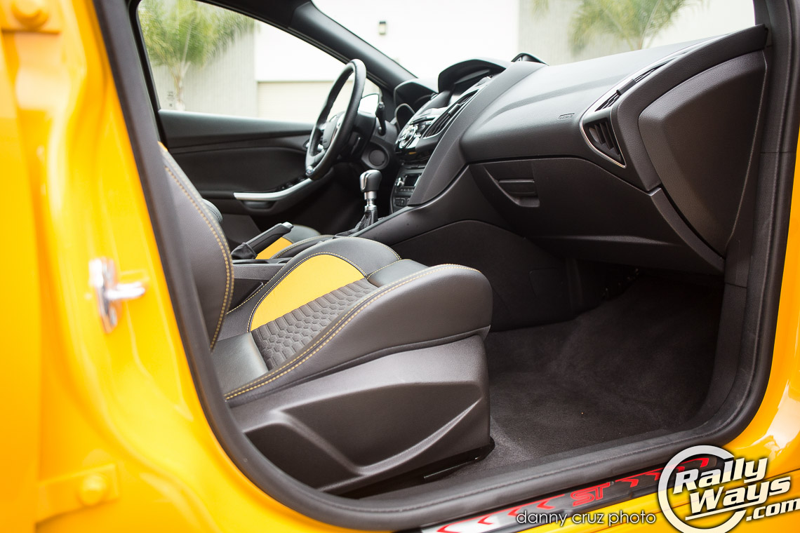 The interior is just as dramatic, if not more. This FoST has the ST2 partial leather Recaro package in a matching Tangerine Scream yellow. There is also a Charcoal Black with Performance Blue option, but it is not offered with the yellow car. One more partial leather option is the Smoke Storm option which is basically all black and greys. For the more posh and serious look you can opt for the ST3 Recaro package which offers full leather.